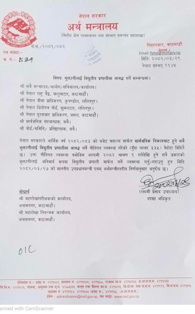 अर्थ मन्त्रालयले आगामी साउन १ गतेदेखि सार्वजनिक निकायबाट गरिने सबै प्रकारका भुक्तानीलाई अनिवार्य रूपमा विद्युतीय प्रणालीमार्फत गर्ने व्यवस्था मिलाउन निर्देशन दिएको छ। मन्त्रालयले यस सम्बन्धमा सबै मन्त्रालय, नेपाल राष्ट्र बैंक, सार्वजनिक संस्थान, बोर्ड, समिति तथा प्रतिष्ठानहरूलाई परिपत्र जारी गरेको छ।