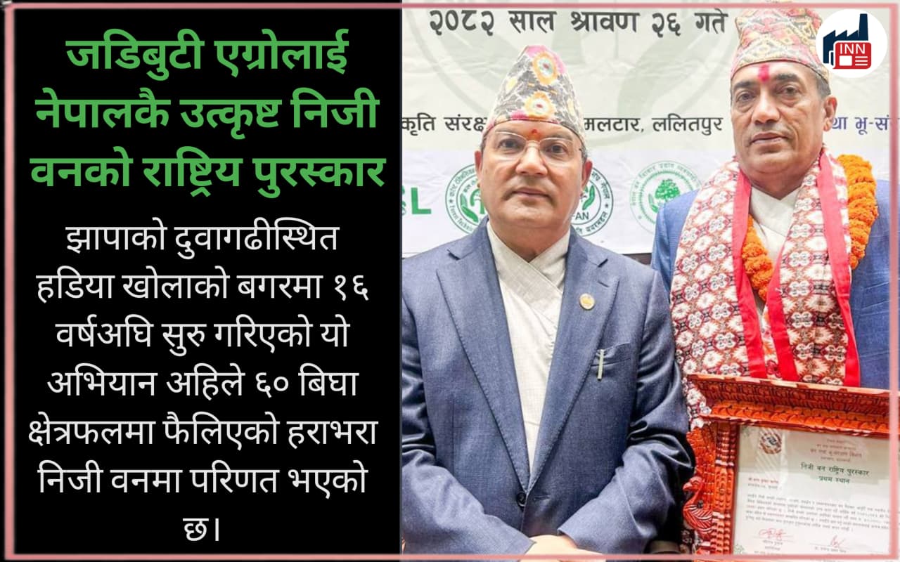 काठमाडौं । वन तथा वातावरण मन्त्रालयले यस वर्षको सामुदायिक वन दिवस-२०८२ को अवसरमा नेपालकै उत्कृष्ट निजी वनका रूपमा झापाको दुवागढीस्थित जडिबुटी एग्रो नर्सरी प्रालिलाई प्रतिष्ठित राष्ट्रिय पुरस्कार प्रदान गरेको छ।
