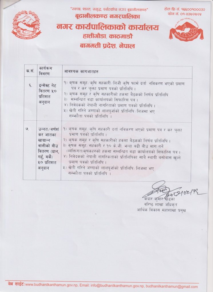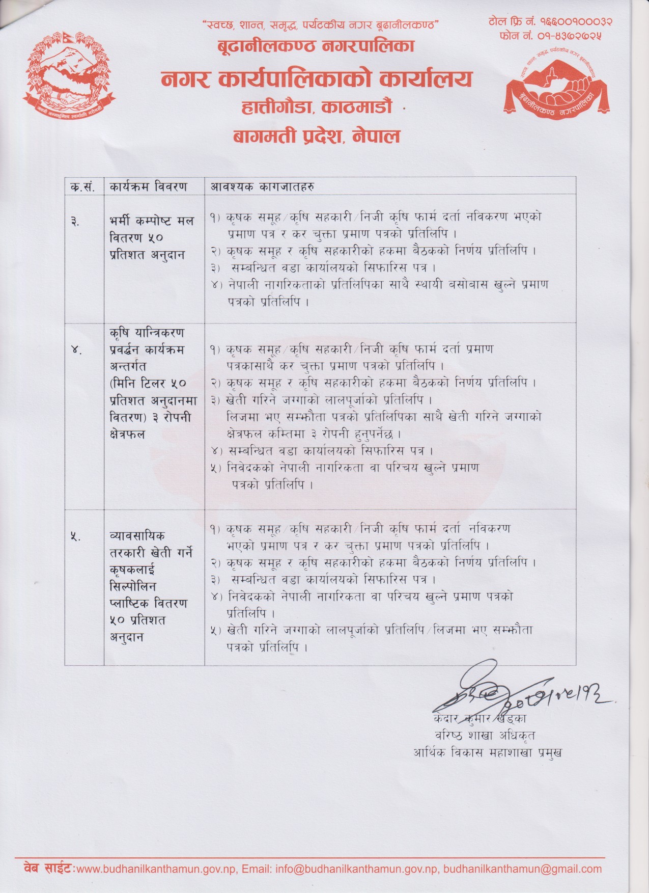 इच्छुक किसान, समूह वा सहकारीले यी सेवाहरूमा ५०% सम्म अनुदान पाउन सक्नेछन्। यसका लागि १५ दिनभित्र नगरपालिकाको कृषि विकास शाखामा आवश्यक कागजातसहित आवेदन दिन सकिनेछ।