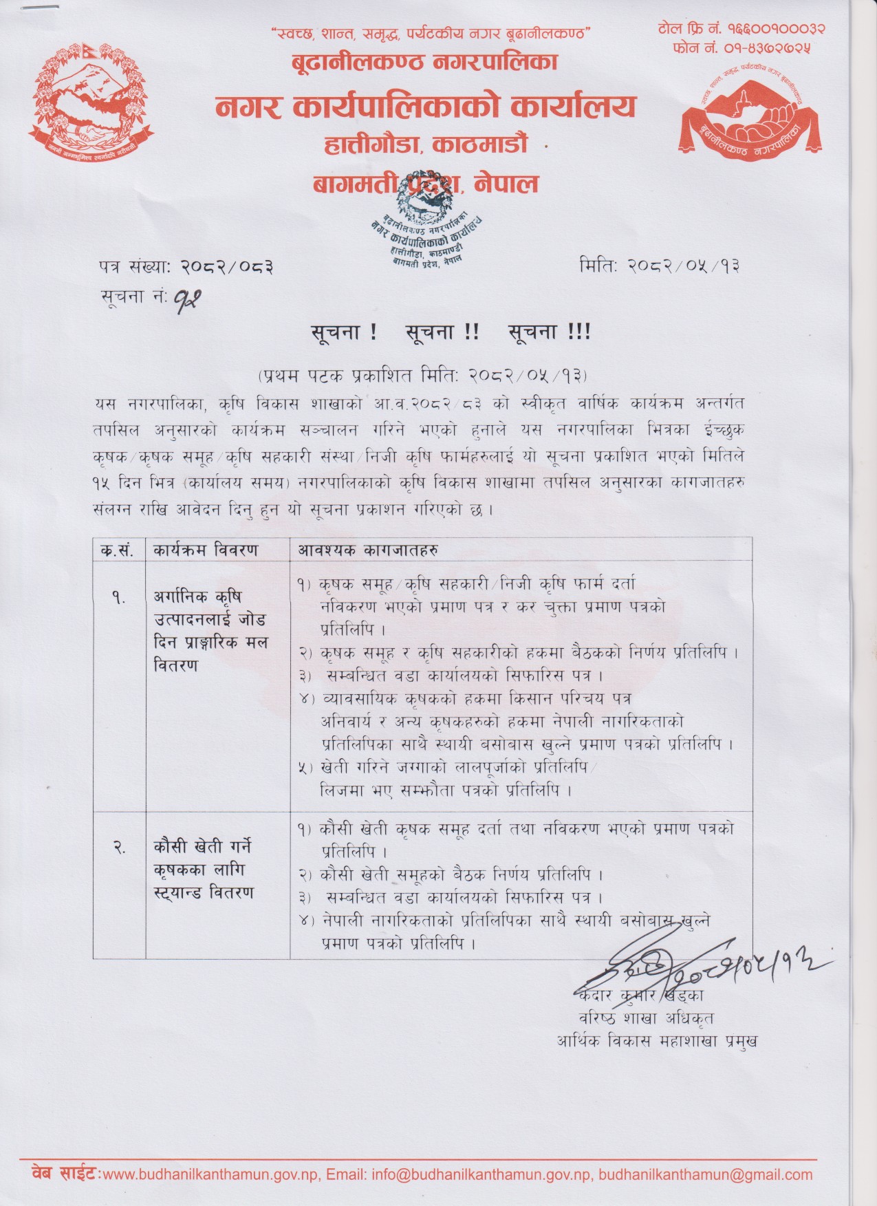 बुढानीलकण्ठ नगरपालिकाले आर्थिक वर्ष २०८२/८३ का लागि विभिन्न कृषि कार्यक्रम घोषणा गरेको छ। यी कार्यक्रमहरू अन्तर्गत अर्गानिक कृषि, कौसी खेती, भर्मी कम्पोष्ट मल, मिनि टिलर, सिल्पोलिन प्लास्टिक र इन्सेक्ट नेट वितरण गरिनेछ। यसका साथै उन्नत जातको धान, गहुँ र मकैको बीउ पनि उपलब्ध गराइनेछ।